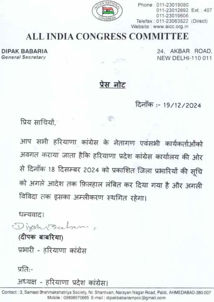पार्टी ने जो जिला प्रभारी पहले से नियुक्त किये थे उनमे से कुछ विधानसभा चुनावों में बागी हो गए थे तथा कुछ ऐसे थे जिन्हे पार्टी ने टिकट नहीं दी तो वह चुनाव मैदान में निर्दलीय रूप से चुनाव मैदान में कूद गए थे और अपनी ही पार्टी के उम्मीदवारों के खिलाफ प्रचार में लगे थे। हालांकि कांग्रेस पहले ही उन्हें 6 साल के लिए पार्टी से निष्कासित कर चुकी है। इसी कारण उदय भान ने उनकी जगह नए जिला प्रभारी नियुक्त कर उनकी सूची जारी की थी , जिसे प्रदेश प्रभारी दीपक बाबरिया ने रोक दिया है। उदयभान द्वारा जारी की गई इस लिस्ट में सांसद कुमारी सैलजा तथा पूर्व केंद्रीय मंत्री चौ बीरेंद्र सिंह के समर्थकों को स्थान नहीं दिया गया। माना जा रहा है कि इसी विवाद के कारण श्री बाबरिया ने उक्त कार्रवाई की। उन्होंने मीडिया को जारी प्रेस नॉट में कहा है कि 18 दिसंबर 24 को जारी की गई जिला प्रभारियों की नियुक्ति अगले आदेश तक लंबित रहेंगी।